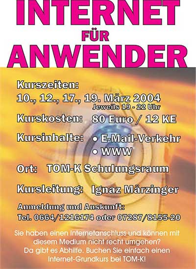 Quelle: Telearbeit Oberes Mühlviertel Kollerschlag TOM-K, erschienen am 17.2.2004 Der Artikel wurde 959 mal gelesen