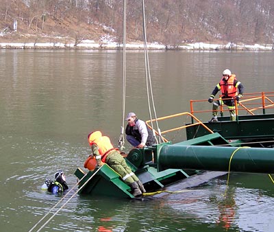 Die Schiffsanlegestelle wurde gestern Nachmittag mit den Einsatztauchern der Freiwilligen Feuerwehr NIEDERRANNA und einem 160 to Autokran aus der Tiefe geborgen.