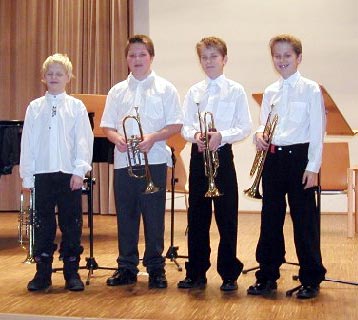 LEMBACH: Mayrhofer Sandro, Hofer Andreas und Markus (alle LMS Lembach) und Aichinger Andreas (LMS Hartkirchen) beeindruckten mit ihrem schwierigen Programm auch die Jury beim Landeswettbewerb PRIMA LA MUSICA am 1. März 2004.