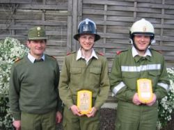 von links Bezirks-Feuerwehrkommandant Nößlböck, Landessieger Wolfgang Hofer und Wolfgang Wießmayr