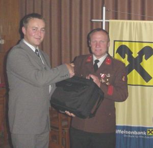 Der Leiter der Bankstelle Hofkirchen Roland Thaller übergibt stellvertretend für die 14 Feuerwehren den Videoprojektor an den Kommandantenstellvertreter der FF Hofkirchen Leopold Mayrhofer