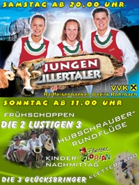 Ab 20.00 Uhr werden dann „Die Jungen Zillertaler“ das Publikum begeistern. Die drei Burschen stellen mit ihrer sympathischen Art und dem unerhört hohen musikalischen Standard viele ihrer älteren Kollegen in den Schatten. Ständige Radio- und TV-Präsenz unterstreichen diese Tatsache. Eine junge Party-Volksmusik, die mit einer technischen Ausrüstung, wie man es nur von größeren Gruppen gewohnt ist, begeistert. Frei nach ihrem Slogan: "Platz für die Jungen!"
