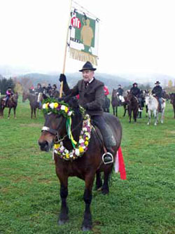 SARLEINSBACH: 150 Reiter trotzten dem winterlichen Wetter beim diesjährigen Leonhardiritt am 7. November in Sarleinsbach mit Feldmesse und Pferdesegnung bei der Leonhard-Kapelle in Pfaffenberg. Pfarrer Alfred und Herr Vinzenz vom Stift Schlägl wurden mit einer Kutsche gefahren.