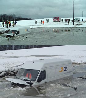 ST.MARTIN: Zu einem spektakulären Verkehrsunfall wurde die FF St. Martin am Freitag, 21.01.05 um ca. 08:00 Uhr morgens gerufen. Ein Pakettransporter war von der Straße abgekommen und in der Ortschaft Unterhart über einen Acker in den sogenannten Sunzingerteich gefahren.