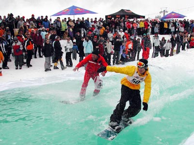 Mutige Snowboarderinnen und Snowboarder starten auf einem Hügel und fahren einzeln auf einer ca. 100 Meter langen Anlaufspur ins Tal. Im Zielauslauf ist ein Wasserkanal angebracht (10m lang, 3m breit, 1/2m tief). Den gilt es durch gekonntes Gleiten auf der Wasseroberfläche zu überqueren. Das dieses Kunststück nicht allen Teilnehmern gelingen wird, ist abzusehen.