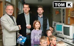 KOLLERSCHLAG. Im Frühjahr 2003 begann der Verein "Telearbeit Oberes Mühlviertel - Kollerschlag", kurz TOM-K ( http://www.tom-k.at ), mit einer Sendeanlage in Kollerschlag die ersten Breitband-Internetanschlüsse herzustellen. Im Herbst 2004 wurde eine eigene Internetstandleitung für das TOM-K Breitband-Internetfunknetzwerk installiert. Mit dieser Leitung wurde auch der Web- und Mailserver für Domainhosting in Betrieb genommen. Bis heute wurden neun weitere Senderstandorte installiert. Diese versorgen große Teile von Julbach, Nebelberg, Kollerschlag und Neustift. Mehr als 150 zufriedene Kunden nutzen derzeit die Dienste, die von TOM-K angeboten werden. Dieser Tage wurde mit der Volksschule Neustift der 100. Funkkunde an das Breitband-Internetfunknetzwerk angeschlossen. Als kleines Dankeschön dafür überreichte Vereinsobmann Ignaz Märzinger (im Bild links) an Volksschuldirektor Richard Gabriel eine neue 3.2 Megapixel Digitalkamera der Marke Olympus im Wert von 169 Euro (im Hintergrund Netzwerktechniker Obmann-Stellvertreter Josef Thaller).