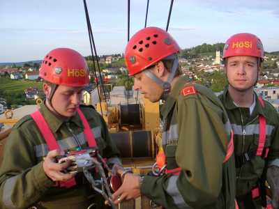 Ein Trupp der Höhensicherungsgruppe bestieg den Baukran und baute das Rollglissgerät (eine Art Flaschenzug) auf. Mit diesem Gerät konnte eine Korbtrage auf den Baukran aufgeseilt und diese dann gemeinsam mit dem Patienten und einem Betreuer wieder abgeseilt werden. Bei der Übungsnachbesprechung wurde festgestellt, dass die Platzverhältnisse auf so einem größeren Kran viel besser sind und und daher die Rettung nicht ganz so schwierig ist, als auf den bisher beübten kleinen Baukränen, wo sich die Kranführerkabine im Gittermasten befindet und durch eine Falltür betreten wird.