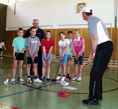 PFARRKIRCHEN: Der Golfclub Pfarrkirchen lud kürzlich die 3. und 4. Klasse der Volksschule Pfarrkirchen zum Golfschnuppern ein. Auf Grund der schlechten Witterung kamen der Nachwuchsbetreuer Erwin Fahrner und der Golflehrer Kurt Wucherer in den Schulturnsaal. Zuerst wurde die Handhabung der Snaggolfschläger erklärt. Das sind speziell für Kinder gefertigte Schläger mit den dazupassenden Bällen. Außerdem wurden in der Einführung wichtige Sicherheitsmaßnahmen demonstriert, um Verletzungen vorzubeugen. An vorbereiteten Spielbahnen erklärten die Trainer die Aufgaben und anschließend übten die Schüler mit viel Eifer und Begeisterung. Sie durften „putten“, über Hindernisse „ chippen“ und sollten diverse Ziele treffen. Den Abschluss und Höhepunkt bildete ein Golfturnier auf den aufgebauten Stationen.