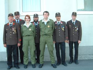 Die vergoldeten Feuerwehrmitglieder Markus Hackl u. Manuela Stöbich mit Kameraden der FF Hofkirchen