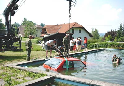 ALTENHOF: Aus ungeklärter Ursache machte sich heute mittag bei einem Betrieb in Altenhof ein PKW selbständig und fuhr ca. 100 Meter über eine Wiese in den nahegelegenen Löschteich, wo es schließlich im Wasser versank.