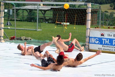 HOFKIRCHEN: Höhepunkt dieser gelungenen Veranstaltung war wiederum das Wasserfußballturnier. 24! Mannschaften und über 120 Gladiatoren stellten sich ab 14 Uhr dem Kampf gegen die Elemente. Größte Kraft in diesem Turnier war zweifellos die Erdanziehung – gepaart mit Schmierseife und Wasser stellte sie die Spieler oft vor ein schier unlösbares Problem. Die Figuren, die die Akteure zeigten, um dem unweigerlichen Fall ins schmierige Nass zu entkommen, erinnerten eher an Abbildungen aus dem Kamasutra als an Fußball. Besonderen Applaus ernteten dabei vor allem die Damen, die sich ob der männlichen Dominanz wacker schlugen und zumindest beim „Sexappeal“ die Nase vorn hatten. Show und Musik sorgten dafür, dass die Stimmung unter den zahlreichen „Stadionbesuchern“ von Beginn an großartig war.