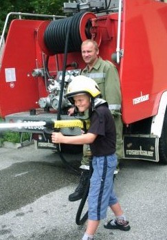 Nach einer kurzen Einleitung wurde Ihnen das Feuerwehrhaus die Fahrzeuge und die vorhandenen Geräte gezeigt und erklärt. Mit Sehnsucht erwarteten sie aber die Fahrt mit dem Feuerwehrauto und dem Spritzen mit dem Hochdruckrohr, bei dem sie selbstverständlich einen echten Feuerwehrhelm tragen durften. Ein Dank an den Lehrkörper der Volksschule, dass sie schon in frühen Jahren versuchen das Interesse für die Feuerwehr in Form von Lehrausgängen zu wecken.