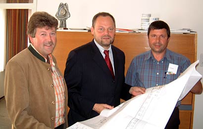 Nun ist es aber höchst an der Zeit, unser Gemeindeamt auch innen den modernen Anforderungen anzupassen. Über Ersuchen von Bürgermeister Martin Raab stattete daher Landesrat und Gemeindereferent Dr. Josef Stockinger kürzlich unserem Gemeindeamt einen Besuch ab. Im Beisein von Bgm. Martin Raab, Vbgm. Manfred Stallinger und Amtsleiter Rupert Höglinger konnte sich Landesrat Stockinger persönlich davon überzeugen, dass die weitere Gemeindeamtssanierung sehr dringend notwendig ist. Vereinbart wurde dabei mit dem Gemeindereferenten Dr.Stockinger, das Sanierungsprojekt möglichst schnell voranzutreiben. Bei einem weiteren Sprechtagstermin im September sollen die näheren Details festgelegt werden. Quasi als Gastgeschenk konnten die drei Gastgeber dem Mitglied der Landesregierung 90.000 € für den weiteren Bau bzw. die Sanierung von Gemeindestraßen entlocken. Dieser Betrag wird in fünf Jahresraten der Gemeinde Hofkrichen i.M. überwiesen.