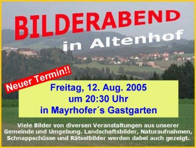 Altenhof: Am Freitag, den 12. August 2005 um 20:30 Uhr findet einen Open-Air Bilderabend im Gastgarten des Gasthauses Mayrhofer in Altenhof statt. Helmut Bauer zeigt Bilder von diversen Veranstaltungen auf Großleinwand. Eine Videozusammenstellung von Josef Rauöcker wird dabei auch zu sehen sein. Für ihr leibliches Wohl gibt es Schmankerl vom Grill und Getränke aller Art.
