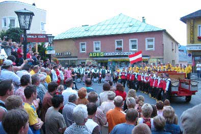 Angeführt von der Marktmusikkapelle und begleitet von ihrem Fanclub, zog die Bewerbsgruppe mit ihren Trainern und Betreuern auf dem Marktplatz ein, wo sie von einer großen Menschenmenge jubelnd empfangen wurde.