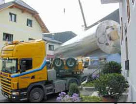 Der Lagerbehälter für PVC-Pulver hat eine Höhe von 24 Meter und einen Durchmesser von 3,5 Meter. Somit kann sich jeder ausdenken, dass eine Ortsdurchfahrt nur mit viel Fingerspitzengefühl möglich ist. Die so genannte „Wart-Kreuzung“ konnte nur durch den Einsatz von zwei Autokränen bewältigt werden.