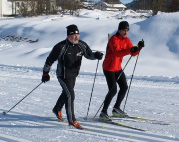 Bürgermeister Franz Saxinger, Kollerschlag (li.) und Bürgermeister Otto Pfeil, Nebelberg (re.) trainieren schon fleißig auf der Loipe KOLLERADO. Saxinger ist Verfechter des klassischen Stils, Pfeil fühlt sich wohl auf der schnellen Skatingspur.