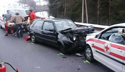 LACKEN: Zu einem schweren Verkehrsunfall mit eingeklemmter Person auf der Rohrbacher Bundesstraße (B127) wurde die Freiwillige Feuerwehr Lacken heute, 23. März 2006, um 6.34 Uhr alarmiert. Der in Richtung Rohrbach fahrende Lukas K. (20) geriet mit seinem Fahrzeug aus bisher ungeklärter Ursache auf die Gegenfahrbahn und kollidierte dort frontal mit dem Auto von Ingeborg S. (48). Er erlitt bei diesem Frontalzusammenstoss schwere Verletzungen und wurde im Fahrzeug leicht eingeklemmt. Die Frau kam hingegen mit einem großen Schrecken davon.