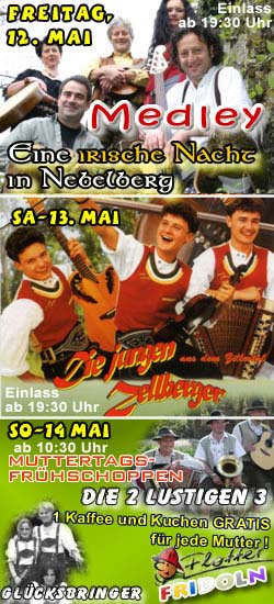 NEBELBERG: Auftakt am Freitag ist eine irische Nacht mit der bekannten Medley Folk Band, die österreichische "Irish Ballad Group", welche durch ihre traditionellen irisch-schottischen Balladen und Tänze die Herzen höher schlagen lassen. Eine gekonnte Mischung von melancholischen Balladen, rauen, lauten Rebellenliedern, der Welt von Guinness und Whiskey. Urplötzlich wird man vom behaglich romantischen Kaminfeuer einer keltischen Festung weggezogen - hinein in irische Pub-Athmosphäre, um dort die heldenhaften Lieder der aufständischen Irishmen und Trinklieder zu hören - alles mit viel irischem Wortwitz garniert. Ein besonderes Angebot gibt es für alle Festbesucher die bis um 21.00 Uhr anwesend sind. Sie erhalten einen ermäßigten Eintritt in der Höhe von € 5,-.