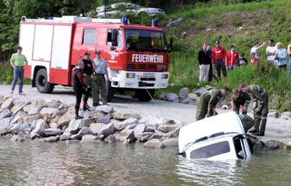 Unterstützt durch die Taucher aus St. Martin und St. Peter, sowie den Feuerwehrbooten vom Stützpunkt St. Peter, Wesenufer und dem Boot der Feuerwehr Niederranna dauerte es fast eine Stunde bis das Fahrzeug geortet, gesichert und schließlich aus ca. 6 Meter Tiefe geborgen werden konnte. Durch die Unterstützung der Seilwinde am LFB der Feuerwehr Hofkirchen wurde das Auto an Land gezogen. Wie wichtig so eine Übung für das Zusammenspiel von Tauchern und Bootsbesatzung ist, zeigt sich auf Grund der schlechten Sicht im Donauwasser und der großen Strömung die einige Tauchgänge benötigen um ein Fahrzeug für die Bergung optimal zu befestigen.