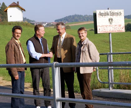 Im Bild sehen wir die beiden Bürgermeister Otto Pfeil (Nebelberg) und Josef Lamperstorfer (Wegscheid) mit Nationalratsabgeordneten Dr. Reinhold Mitterlehner (Bildmitte) sowie Vizebürgermeister Heinrich Pfoser bei einer ersten Besichtigung der neuen Brücke, welche am Sonntag, 18. Juni offiziell mit einem gemeinsamen Fest „Bayern-Österreich“ eröffnet wird.