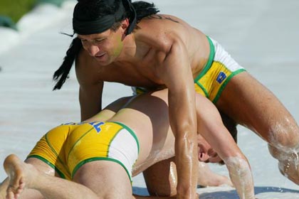 Show und Musik sorgten dafür, dass die Stimmung unter den zahlreichen „Stadionbesuchern“ von Beginn an großartig war. Die Welle und die Hymne der Beachssportmania „Brown Girl in the rain“ brachten die Seifenarena nicht nur ob der heißen Temperaturen zum kochen.