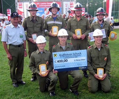 Zwischen 1994 und 1997 wurde bei den Aktivgruppen ja schon 4mal der Landesbewerb gewonnen. Dann war man nie schlechter als dritter. Der Sieg aber wollte einfach nicht gelingen. Umso größer ist also jetzt die Freude, konnte doch gleich ein Sieg in Bronze und Silber, also zwei Klassen erreicht werden. Die erfolgreiche Gruppe lief in der Besetzung: Siegfried Kehrer, Leopold Pühringer, Christian Kaimberger, Josef Kleebauer, Peter Kleebauer, Josef Kepplinger, Markus Gierlinger, Herbert Lanzersdorfer, Wolfgang Hofer und August Bogendorfer; Betreuer: Franz Kaineder. Der Grundstein zum Sieg wurde sicher im Löschangriff gelegt, ein fulminanter Staffellauf bedeutete aber die Krönung.