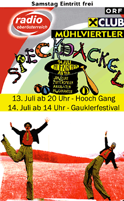 Die veranstaltende Kulturgruppe Hofis hat das Mühlviertler Speckdackel fest in der Szene der Straßenkunstfestivals in Österreich etabliert. Ein Sammelsurium an Klang- und Lichteffekten, , Sambar, Clownerie, Artisten, Zauberei, Jonglage, Stelzenakrobatik, Roboter, Feuerakrobaten, Straßenbands, musikalischen Schmankerl usw. wird die Besucher auch in diesem Jahr faszinieren. Wie in den Vorjahren wurden mehr als 100 Profikünstler aus dem In- und Ausland engagiert (Australien, Neuseeland, Schweiz, Deutschland, Niederlande, Slowakei und natürlich Österreich). Ein Straßenkunstfestival auf künstlerisch hohem Niveau bietet sich den Besuchern in Hofkirchen i.M. - SAMSTAG FREIER EINTRITT -(Freitag abend 70,- S ermäßigter Eintritt 50,-, wohlgemerkt nur am Freitag abend, Samstag ist freier Eintritt )