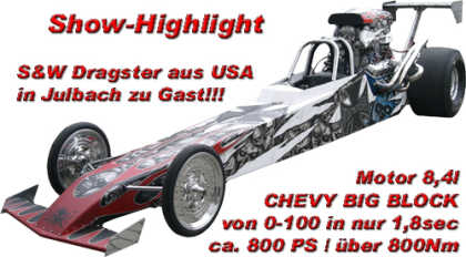 JULBACH: Die Freiwillige Feuerwehr Julbach hat nun die Bestätigung erhalten, dass bei der 2. Julbacher Motorsportshow am 31. Mai und 1. Juni 2008 neben Lowrider, Soundcar, Stuntshow, Casinos Austria, Formel 1 Rennwagen und ca. 130 Fahrer mit verschiedenen Fahrzeugen, jetzt auch ein S&W Dragster in Julbach zu Gast sein wird.