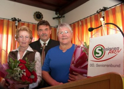 Seniorenbundobmann Erich Würfl bedankte sich für die Gestaltung der gelungenen Feier bei Paula Höllinger (li.) und Lore Hollnsteiner (re.).
