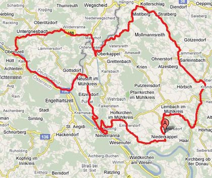 Die 97 Km lange Strecke führt nach Hofkirchen, Niederanna, Neustift, Gottsdorf(D), Jochenstein(D), Obernzell(D), Untergriesbach(D), Oberkappel (Pause), Kollerschlag, Sarleinsbach, Hühnergeschrei, Lembach und zurück nach Niederkappel.