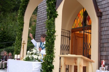KOLLERSCHLAG – Mit einem Kostenaufwand von 150.000 Euro wurde die vom „Wangerfritz“ vor 50 Jahren erbaute Kleinkirche auf der Anhöhe des Dorfes Stratberg von Grund auf renoviert. Pfarrer Laurenz Neumüller segnete anlässlich eines Festgottesdienstes am Feiertag Maria Himmelfahrt das sakrale Kleinod. Als Zeichen der Volksfrömmigkeit und der Marienverehrung der Bevölkerung ist zu werten, dass hunderte Gläubige mit der Großfamilie Neißl und den Stratbergern mitfeierten. Ein kleiner Wermutstropfen war der beim Gottesdienst einsetzende Regen. Der Festakt musste daher in ein vorsorglich aufgestelltes Zelt verlegt werden. Bezirkshauptfrau Hofrätin Dr. Wilbirg Mitterlehner, eine Großnichte des Gründers, ging in ihrer Festansprache auf die Entstehungsgeschichte der Lourdeskapelle ein. Sie bedankte sich besonders bei Berta Hurnaus und Fritz Neißl, Kinder des vor 5 Jahren verstorbenen Kirchenbauers dafür, dass sie die Organisation der Renovierungsarbeiten, die 3 Jahre dauerten, übernommen haben. Den Dank sprach sie auch dem Land Oberösterreich, der Marktgemeinde Kollerschlag und der Pfarre für die finanzielle Unterstützung aus, aber auch den vielen freiwilligen Helfern. Da der „Stoanaweg“, eine bekannte Wanderroute in Kollerschlag, direkt an der Lourdeskapelle vorbeiführt, bietet die idyllisch gelegene Kapelle auch eine gute Möglichkeit zum Innehalten empfahl Bürgermeister Kons. Franz Saxinger in seinen Grußworten.