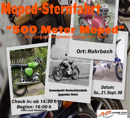 ROHRBACH: Gemeinsam mit euch wollen wir die Veranstaltungen unter dem Thema „500 Meter Moped – die längste Mopedschlange der Welt“ über die Bühne bringen.