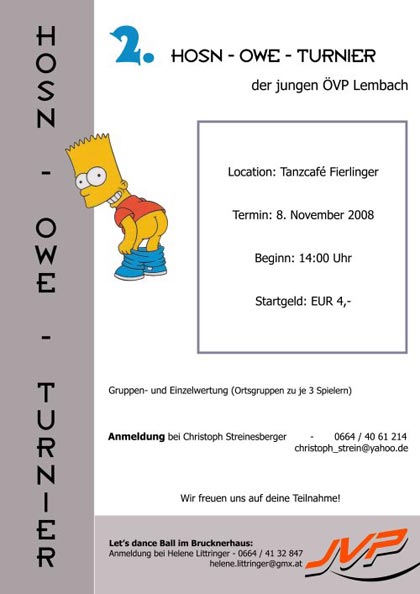 Aufgrund des großen Erfolgs im letzten Jahr, veranstaltet die Junge ÖVP Lembachs heuer bereits zum zweiten Mal das Hosn-Owe-Turnier. Diesmal wird der strategische Wettkampf im allseits bekannten Tanzcafé Fierlinger ausgetragen.