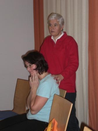 Frau Mathilde Hermann zeigt die Technik der Craniosacraltherapie.