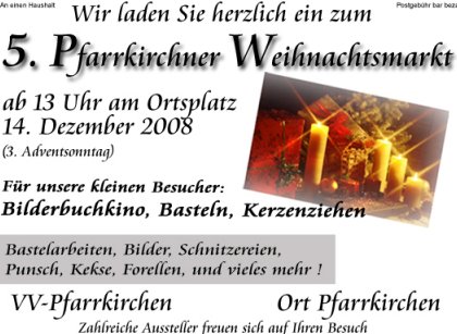 Lassen Sie sich ab 13.00 Uhr am Ortsplatz von Pfarrkirchen in vorweihnachtliche Adventstimmung verzaubern! Veranstalter des Weihnachtsmarktes ist der Verschönerungsverein Pfarrkirchen und die Ortsgemeinschaft Pfarrkirchen.