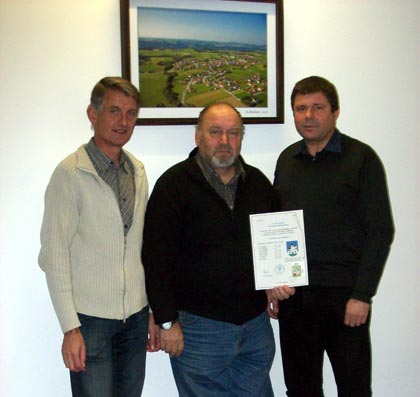 Vlnr: Amtsleiter Rupert Höglinger, Josef Wakolbinger und Bgm. Martin Raab mit dem Briefmarken-Gedenkblatt