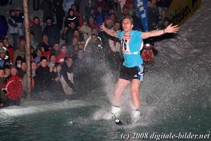 Die Teilnehmer versuchen mit Ski& Snowboard über das etwa 25 Meter lange Becken zu fahren. Dabei wird von Durchgang zu Durchgang der Anlauf verkürzt, solange, bis nur mehr ein Läufer im Trockenen bleibt- das ist somit der Sieger. In der Sonderklasse versuchen selbstgebastelte Gefährte das Wasserbecken zu überqueren. Anschließend folgt die spektakuläre Motorschlittenshow. Diesmal werden auch Snowboarder an der Leine von den Motorschlitten über den reißenden Wasserkanal gezogen, eine attraktive aber gefährliche Einlage.
