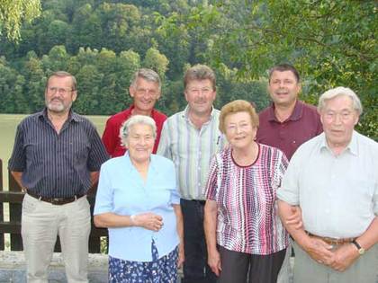 Vl.: SB-Obmann Erich Moser, Gde-AL Rupert Höglinger davor Hildegard Stallinger vom SB, Vbgm. Manfred Stallinger, Jubilarin Auguste Scheiblberger, Bgm. Martin Raab, Leopold Scheiblberger