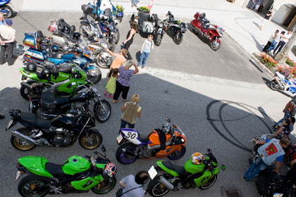 Unser schöner Ort Hofkirchen erhielt so für kurze Zeit das Flair einer Rennveranstaltung. Nachdem ein Biker zwei symbolische Hochzeitsringe mit den Hinterreifen in den Asphalt vor dem Rathaus brannte, setzte sich der Hochzeitszug in Richtung Lembach in Bewegung.In den durchfahrenen Orten Lembach und Niederkappel ertönte nicht nur das Posthorn der beiden Postbusse und das Motorengeheul der Bikes, sondern auch tosender Applaus zahlreicher Schaulustiger.