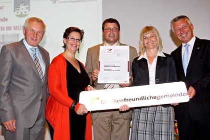 von links: LH-Stv. Familienlandesrat Franz Hiesl, Familien-Staatssekretärin Christine Marek, Bgm. Martin Raab, Familienausschuss-Obfrau Gertraud Scheiblberger, Präsident des österreichischen Gemeindebundes Bgm. Helmut Mödlhammer