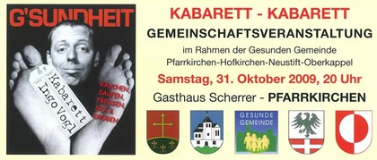PFARRKIRCHEN: Das Kabarett „G’SUNDHEIT“ ist eine andere Art der Gesundheitsvorsorge - hier geht's um alles was Spaß macht "Rauchen, Saufen, Fressen, Sex und Drogen". Freuen Sie sich auf einen lustigen Abend für Jung & Alt!Nähere Informationen dazu finden Sie im Internet unter http://www.pfarrkirchen.at/gesundegemeinde