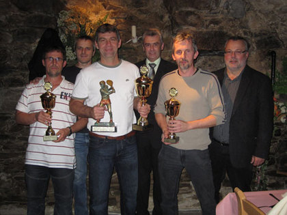 Auf dem Foto v.l.n.r.: Vorne die Mannschaftsführer Cerkl (Horni Plana), Uwe Lehfeldt (Wegscheid) und Alfred Hopfner (Kollerschlag), hinten die Bürgermeister Jiri Hulka , Josef Lamperstorfer und Franz Saxinger bei der Siegerehrung im Gasthof Haiböck in Wegscheid. In der Kollerschlager Mannschaft spielten weiters: Johann Lehner, Josef Pfarrwaller, Andreas Leitner und Josef Krenn.