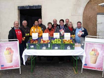 Mitglieder des Gemeinderats verteilen am Marktplatz die gesunden Äpfel.
