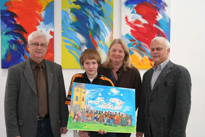 Lions-Club-Präsident Leo Heinzl, Zeichenlehrerin Andrea Nömair und Bezirksschulinspektor Karl Danzer (v.re.) gratulieren Daniel Wöss (13) aus Ulrichsberg zur Teilnahme am internationalen Lions-Friedensplakat-Wettbewerb, der heuer unter dem Motto „Die Macht des Friedens“ steht.