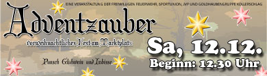 KOLLERSCHLAG. Am Samstag, den 12. Dezember veranstalten die Sportunion, Freiw. Feuerwehr, JVP und die Goldhaubengruppe Kollerschlag am Marktplatz ein vorweihnachtilches Fest mit, zur Adventzeit passenden Getränken und Imbissen.
