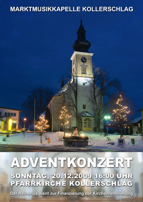 Kollerschlag - Am Sonntag, 20. Dezember 2009, 16.00 Uhr, findet in der Pfarrkirche Kollerschlag ein Adventkonzert statt. Unter der Gesamtleitung von Alfred Hofmann sorgen folgende Kapellen bzw. Gruppen für Adventstimmung: