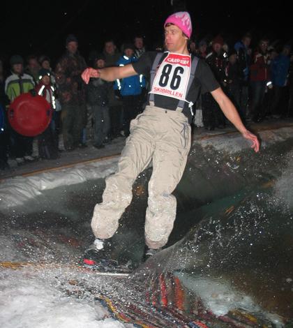 Weniger Glück hatten an diesem Tag die Fahrer der Motorschlitten. Gleich 2 von 3 Startern versenkten ihren Schlitten im Wasser. Hötzendorfer Josef aus Julbach ging bereits auf den ersten Metern mit seinem Skidoo baden. Lediglich Christian Mondl aus Peilstein brachte sein Gerät ohne Schaden sicher nach Hause. Zum Abschluss kam es zum Höhepunkt der Veranstaltung. Der Versuch, mit einem Motorschlitten einen Snowboarder an einer Leine übers Wasser zu ziehen, endete für die beiden Akteure mit einem grandiosen Abgang: Der Motorschlittenfahrer Dominik Richtsfeld aus Kollerschlag verschwand samt Motorschlitten im Wasser und Snowboarder Stefan Märzinger folgte ihm nur wenig später eindrucksvoll nach. Zuvor gelang es Richtfeld, mit Fabian Ploch aus Heinrichsberg auf einem Schwimmreifen sitzend im Gepäck, über das Wasser zu kommen.