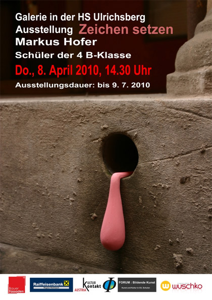 ULRICHSBERG - HASLACH. Am Donnerstag, den 8. April findet um 14.30 Uhr die Projektpräsentation und Ausstellungseröffnung "Zeichen setzen" in der Hauptschule Ulrichsberg statt. Die Präsentation wird musikalisch vom Schulorchester begleitet, eine kleine Bewirtung steht ebenfalls auf dem Programm. Die Ausstellung kann auch später noch bis zum 9. Juli 2010 an allen Schultagen von 8 - 17 Uhr besichtigt werden. Für die Projektbetreung und Projektorganisation zeichnen Theresia Obermüller und Gerhard Wöß verantwortlich. Geleitet wurde das Projekt von Markus Hofer (Biografie siehe Link unten).