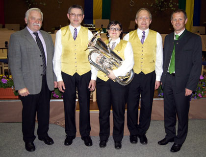 Von der Raiffeisenbank Region NeufeldenEin wurde ein Euphonium gesponsert. Sandra Kaindlbinder bei der Überreichung durch Vertreter der örtlichen Raiffeisenbank.